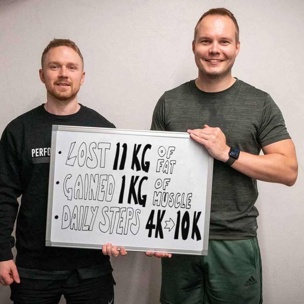 Timo achieved results through simple changes: regular eating habits, balanced meals, more protein, and strength training. His daily steps went from 4,000 to 8,000–10,000.